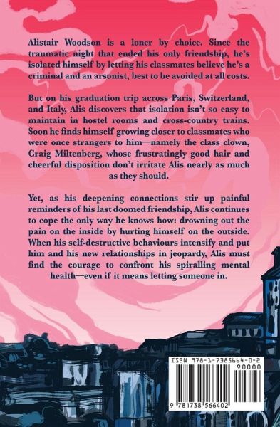 Alistair Woodson is a loner by choice. Since the traumatic night that ended his only friendship, he's isolated himself by letting his classmates believe he's a criminal and an arsonist, best to be avoided at all costs. But on his graduation trip across Paris, Switzerland, and Italy, Alis discovers that isolation isn't so easy to maintain in hostel rooms and cross-country trains. Soon he finds himself growing closer to classmates who were once strangers to him-namely the class clown, Craig Miltenberg, whose frustratingly good hair and cheerful disposition don't irritate Alis nearly as much as they should. Yet, as his deepening connections stir up painful reminders of his last doomed friendship, Alis continues to cope the only way he knows how: drowning out the pain on the inside by hurting himself on the outside. When his self-destructive behaviours intensify and put him and his new relationships in jeopardy, Alis must find the courage to confront his spiralling mental health-even if it means letting someone in. Lex Carlow's gritty queer debut is perfect for fans of Alice Oseman, Kathleen Glasgow, and The Perks of Being a Wallflower.