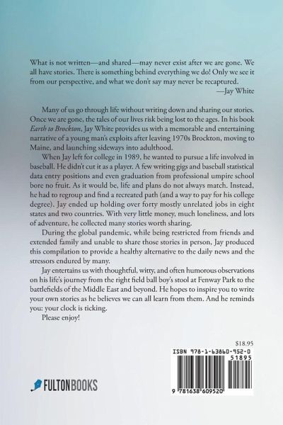 What is not written--and shared--may never exist after we are gone. We all have stories. There is something behind everything we do! Only we see it from our perspective, and what we don't say may never be recaptured. --Jay White Many of us go through life without writing down and sharing our stories. Once we are gone, the tales of our lives risk being lost to the ages. In his book Earth to Brockton, Jay White provides us with a memorable and entertaining narrative of a young man's exploits after leaving 1970s Brockton, moving to Maine, and launching sideways into adulthood. When Jay left for college in 1989, he wanted to pursue a life involved in baseball. He didn't cut it as a player. A few writing gigs and baseball statistical data entry positions and even graduation from professional umpire school bore no fruit. As it would be, life and plans do not always match. Instead, he had to regroup and find a recreated path (and a way to pay for his college degree). Jay ended up holding over forty mostly unrelated jobs in eight states and two countries. With very little money, much loneliness, and lots of adventure, he collected many stories worth sharing. During the global pandemic, while being restricted from friends and extended family and unable to share those stories in person, Jay produced this compilation to provide a healthy alternative to the daily news and the stressors endured by many. Jay entertains us with thoughtful, witty, and often humorous observations on his life's journey from the right field ball boy's stool at Fenway Park to the battlefields of the Middle East and beyond. He hopes to inspire you to write your own stories as he believes we can all learn from them. And he reminds you: your clock is ticking. Please enjoy!