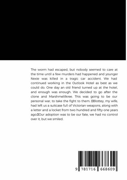 The worm had escaped, but nobody seemed to care at the time until a few murders had happened and younger Nexie was killed in a tragic car accident. We had continued working in the Outlook Hotel as best as we could do. One day an old friend turned up at the hotel, and enough was enough. We decided to go after the clone and Marshmelilkree. This was going to be our personal war, to take the fight to them. Blottey, my wife, had left us a suitcase full of Victorian weapons, along with a letter and a locket from two hundred and fifty-one years ago. Our adoption was to be our fate, we had no control over it, but we smiled.