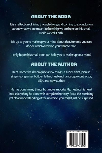 It is a reflection of living through doing and coming to a conclusion about what we are meant to be while we are here on this small world we call Earth. It is up to you to make up your mind about that, for only you can decide which direction you want to take. I only hope this small book can help you to make up your mind.