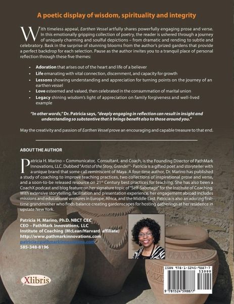 With timeless appeal, Earthen Vessel artfully shares powerfully engaging prose and verse. In this emotionally gripping collection of poetry, the reader is ushered through a journey of uniquely charming and soulful depictions from dramatic and rending to subtle and celebratory. Bask in the surprise of stunning blooms from the authors prized gardens that provide a perfect backdrop for each selection. Pause as the author invites you to a tranquil place of personal refl ection through fi ve classic themes: Adoration that arises out of the heart and life of a believer Life emanating with vital connection, discernment, and capacity for growth Lessons showing understanding and appreciation for turning points on the journey of an earthen vessel Love esteemed and valued, then celebrated in the consummation of marital union Legacy shining wisdoms light of appreciation on family forgiveness and well-lived example In other words, Dr. Patricia says, deeply engaging in refl ection can result in insight and understanding so substantive that it brings benefi t also to those around you. May the creativity and passion of Earthen Vessel prove an encouraging and capable treasure to that end.