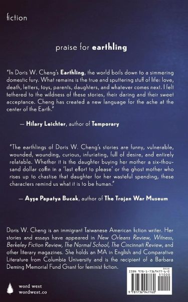 "In Doris W. Cheng's EARTHLING, the world boils down to a simmering domestic fury. What remains is the true and sputtering stuff of life: love, death, letters, toys, parents, daughters, and whatever comes next. I felt tethered to the wildness of these stories, their daring and their sweet acceptance. Cheng has created a new language for the ache at the center of the Earth." - Hilary Leichter, author of Temporary "The earthlings of Doris W. Cheng's stories are funny, vulnerable, wounded, wounding, curious, infuriating, full of desire, and entirely relatable. Whether it is the daughter buying her mother a six-thousand dollar coffin in a 'last effort to please," the ghost mother who rises up to chastise that daughter for her wasteful spending, the talking teddy bear with 'many demands,' or the levitating child who needs gravitational therapy to hold her to earth. These characters remind us, in the most surprising ways, what it is to be human." - Ayse Papatya Bucak, author of The Trojan War Museum Doris W. Cheng is an immigrant Taiwanese American fiction writer. Her stories and essays have appeared in New Orleans Review, Witness, Berkeley Fiction Review, The Normal School, The Cincinnati Review, and other literary magazines. She holds an MA in English and Comparative Literature from Columbia University and is the recipient of a Barbara Deming Memorial Fund Grant for feminist fiction.