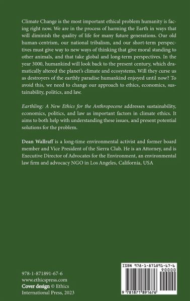 Climate Change is the most important ethical problem humanity is facing right now. We are in the process of harming the Earth in ways that will diminish the quality of life for many future generations. Our old human-centrism, our national tribalism, and our short-term perspectives must give way to new ways of thinking that give moral standing to other animals, and that take global and long-term perspectives. In the year 3000, humankind will look back to the present century, which dramatically altered the planet's climate and ecosystems. Will they curse us as destroyers of the earthly paradise humankind enjoyed until now? To avoid this, we need to change our approach to ethics, economics, sustainability, politics, and law. Earthling: A New Ethics for the Anthropocene addresses sustainability, economics, politics, and law as important factors in climate ethics. It aims to both help with understanding these issues, and present potential solutions for the problem.