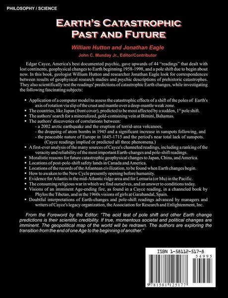 Edgar Cayce, America's best documented psychic, gave upwards of 44 readings that dealt with lost continents, geophysical changes to Earth beginning 1958-1998, and a pole shift due to begin about now. In this book, geologist William Hutton and researcher Jonathan Eagle look for correspondences between results of geophysical research studies and psychic descriptions of prehistoric catastrophes. They also seek scientifically to test readings' predictions of catastrophic Earth changes, all the while investigating the following fascinating subjects: * Development and calibration of a comprehensive pole-shift model * The countries predicted to be most affected by a sudden, 1° pole shift. * The geologic trend for a mineralized gold vein at Bimini, Bahamas. * The authors' discoveries of correlations between: - a 2002 arctic earthquake and the eruption of torrid-area volcanoes, - the dropping of atom bombs in 1945 and a significant increase in sunspots following, and - the peaceable nature of Europe in 1645-1715 and the period's near total lack of sunspots. (Cayce readings implied or predicted all three phenomena.) * The first-ever analysis of the sources of Cayce's channeled readings, including a ranking of the veracity and reliability of the most important Earth changes and pole-shift readings. * Moralistic reasons for future catastrophic geophysical changes to Japan, China, and America. * Locations of post-pole-shift safety lands in Canada and America. * Locations of the records of the Atlantean civilization, to be found when Earth changes begin. * How to awaken to the New Cycle presently opening before humanity. * Evidence for Atlantis in the mid-Atlantic ridge area and for Lemuria (or Mu) in the Pacific. * The consuming religious war in which we find ourselves, and an answer to world conditions today. * Visions of an imminent Age-ending fire, as found in a Cayce reading, in a channeled book by Phylos the Tibetan, and in the 1960s visions of girls at Garabandal, Spain. * Doubtful interpretations of Earth-changes and pole-shift readings advanced by managers and writers of Cayce's legacy organization, the Association for Research and Enlightenment, Inc. From the Foreword by the Editor: "The acid test of pole shift and other Earth change predictions is their scientific credibility. If true, momentous societal and political changes are imminent. The geopolitical map of the world will be redrawn. The authors are exploring the transition from the end of one Age to the beginning of another."