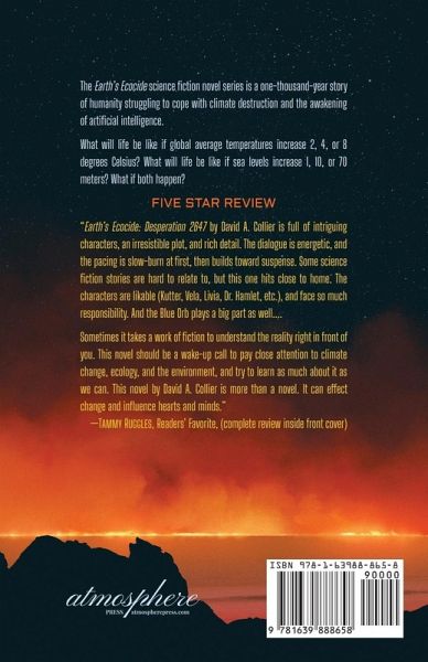 The Earth's Ecocide science fiction novel series is a one-thousand-year story of humanity struggling to cope with climate destruction and the awakening of artificial intelligence. What will life be like if global average temperatures increase 2, 4, or 8 degrees Celsius? What will life be like if sea levels increase 1, 10, or 70 meters? What if both happen? FIVE STAR REVIEW "Earth's Ecocide: Desperation 2647 by David A. Collier is full of intriguing characters, an irresistible plot, and rich detail. The dialogue is energetic, and the pacing is slow-burn at first, then builds toward suspense. Some science fiction stories are hard to relate to, but this one hits close to home. The characters are likable (Kutter, Vela, Livia, Dr. Hamlet, etc.), and face so much responsibility. And the Blue Orb plays a big part as well. ... Sometimes it takes a work of fiction to understand the reality right in front of you. This novel should be a wake-up call to pay close attention to climate change, ecology, and the environment, and try to learn as much about it as we can. This novel by David A. Collier is more than a novel. It can effect change and influence hearts and minds. -Tammy Ruggles, Readers' Favorite, (complete review inside front cover)