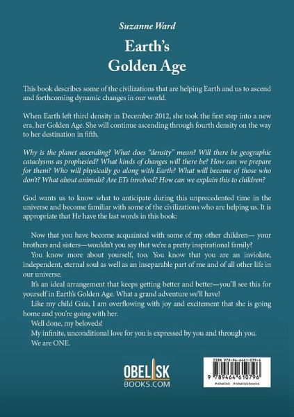 This book describes some of the civilizations that are helping Earth and us to ascend and forthcoming dynamic changes in our world. When Earth left third density in December 2012, she took the first step into a new era, her Golden Age. She will continue ascending through fourth density on the way to her destination in fifth. Why is the planet ascending? What does "density" mean? Will there be geographic cataclysms as prophesied? What kinds of changes will there be? How can we prepare for them? Who will physically go along with Earth? What will become of those who don't? What about animals? Are ETs involved? How can we explain this to children? God wants us to know what to anticipate during this unprecedented time in the universe and become familiar with some of the civilizations who are helping us. It is appropriate that He have the last words in this book: Now that you have become acquainted with some of my other children- your brothers and sisters-wouldn't you say that we're a pretty inspirational family? You know more about yourself, too. You know that you are an inviolate, independent, eternal soul as well as an inseparable part of me and of all other life in our universe. It's an ideal arrangement that keeps getting better and better-you'll see this for yourself in Earth's Golden Age. What a grand adventure we'll have! Like my child Gaia, I am overflowing with joy and excitement that she is going home and you're going with her. Life beyond 2012 Earth's Golden Age Well done, my beloveds! My infinite, unconditional love for you is expressed by you and through you. We are ONE.