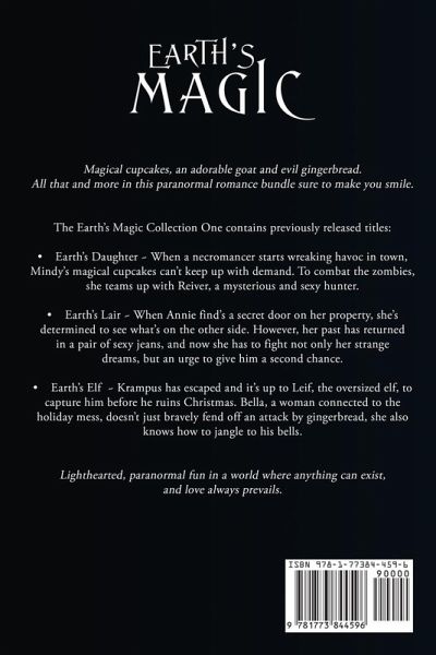 Magical cupcakes, an adorable goat and evil gingerbread. All that and more in this paranormal romance bundle sure to make you smile. The Earth's Magic Collection One contains previously released titles: ¿ Earth's Daughter ~ When a necromancer starts wreaking havoc in town, Mindy's magical cupcakes can't keep up with demand. To combat the zombies, she teams up with Reiver, a mysterious and sexy hunter. ¿ Earth's Lair ~ When Annie find's a secret door on her property, she's determined to see what's on the other side. However, her past has returned in a pair of sexy jeans, and now she has to fight not only her strange dreams, but an urge to give him a second chance. ¿ Earth's Elf ~ Krampus has escaped and it's up to Leif, the oversized elf, to capture him before he ruins Christmas. Bella, a woman connected to the holiday mess, doesn't just bravely fend off an attack by gingerbread, she also knows how to jangle to his bells. Lighthearted, paranormal fun in a world where anything can exist, and love always prevails.