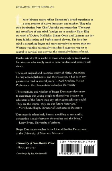 These thirteen essays reflect Dunsmore's broad experience as a poet, student of native literature, and teacher. They take their inspiration from Chief Joseph's statement that "the Earth and myself are of one mind," and go on to consider Black Elk; the work of D'Arcy McNickle, Simon Ortiz, and Laurens van der Post; Salish stories; and Pueblo sacred clowns. The idea that mind is something larger and more pervasive in nature than the Western tradition has usually considered suggests respect as central to survival and conveys the essential wildness of mind. Earth's Mind will be useful to those who study or teach native literature or who simply want to understand better native world views. "The most original and evocative study of Native American literary accomplishments, and their sources, it has been my pleasure to read in several years."--Karl Kroeber, Mellon Professor in the Humanities, Columbia University