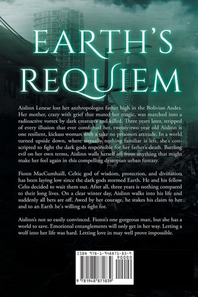 Large Print Edition Aislinn Lenear lost her anthropologist father high in the Bolivian Andes. Her mother, crazy with grief that muted her magic, was marched into a radioactive vortex by dark creatures and killed. Three years later, stripped of every illusion that ever comforted her, twenty-two year old Aislinn is one resilient, kickass woman with a take no prisoners attitude. In a world turned upside down, where virtually nothing familiar is left, she's conscripted to fight the dark gods responsible for her father's death. Battling evil on her own terms, Aislinn walls herself off from anything that might make her feel again in this compelling dystopian urban fantasy. Fionn MacCumhaill, Celtic god of wisdom, protection, and divination has been laying low since the dark gods stormed Earth. He and his fellow Celts decided to wait them out. After all, three years is nothing compared to their long lives. On a clear winter day, Aislinn walks into his life and suddenly all bets are off. Awed by her courage, he stakes his claim to her and to an Earth he's willing to fight for. Aislinn's not so easily convinced. Fionn's one gorgeous man, but she has a world to save. Emotional entanglements will only get in her way. Letting a wolf into her life was hard. Letting love in may well prove impossible.