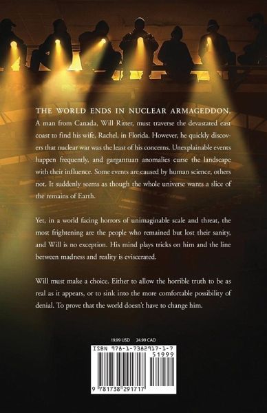 From the back cover: "In this Mind-Bending Sci-Fi Thriller, the world ends in nuclear Armageddon. A man from Canada, Will Ritter, must traverse the devastated east coast to find his wife, Rachel, in Florida. However, he quickly discovers that nuclear war was the least of his concerns. Unexplainable events happen frequently, and gargantuan anomalies curse the landscape with their influence. Some events are caused by human science, others not. It suddenly seems as though the whole universe wants a slice of the remains of Earth. Yet, in a world facing horrors of unimaginable scale and threat, the most frightening are the people who remained but lost their sanity, and Will is no exception. His mind plays tricks on him and the line between madness and reality is eviscerated. Will must make a choice. Either to allow the horrible truth to be as real as it appears, or to sink into the more comfortable possibility of denial. To prove that the world doesn't have to change him." In this harrowing tale of humanity well past the brink of insanity, Canadian author J. F. Bloomfield takes the reader on a dangerous adventure through the corpse of a world that went horribly wrong. Starting off unprepared and deathly afraid, the main character, Will, just barely makes it underground with some hiking and camping gear and has to plan his journey south into the remnants of the coastal United States to find his wife, who was on a company sales trip to Florida when the bombs fell. What awaits him down the coast is nothing short of soul-rending. He pushes forward with speed and priority firstly because he wants to reach his wife quickly for the best chances of finding her alive. Secondly, however, because he doesn't know how much longer he can last. The freaks of nature and anomalies of physics take their toll and change both his body and his mind in disturbing ways. Who is he now? Will his wife recognize him anymore? He thinks that he might've wasted too much time getting banged up, knocked unconscious, and crying because it was all too much. Was she dead? Or did he still have a chance? How valuable is a few hours of sleep compared to the chance of your less-prepared loved one dying in that same time? It becomes obvious to him that every part of the country was hit by a different experimental bomb that pushed the boundaries of what was possible to predict. What else would he find? New York was a nightmare for the ages, D.C. was a chasm in the ground, the Carolinas were a lost cause. What would Rachel have had to survive in Florida? The author invites you to join him on this complex mission to discover who we really are when no concept goes unspoiled by the wildest impossibilities.