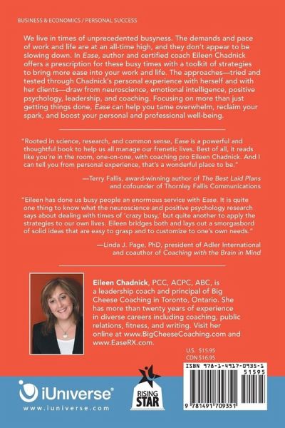 We live in times of unprecedented busyness. The demands and pace of work and life are at an all-time high, and they don't appear to be slowing down. Whether our loads are self-imposed or put on us by others, most of us are doing our best to squeeze it all in-and we're starting to burst at the seams. In Ease, author and certified coach Eileen Chadnick offers a prescription for these busy times with a toolkit of hundreds of tips and strategies to bring more ease into your work and life. The strategies-tried and tested through Chadnick's personal experience with herself and her clients-draw from the wisdom of neuroscience, emotional intelligence, positive psychology, leadership, and coaching. In Ease, Chadnick divides the tools into three areas of focus to leverage the mind-brain connection, empower mindful thinking strategies, and highlight the positivity advantage. Ease is about more than just getting things done; it seeks to help you alleviate overwhelm, reconnect with your work-life mojo, and experience greater personal and professional well-being. "Rooted in science, research, and common sense, Ease is a powerful and thoughtful book to help us all manage our frenetic lives. Best of all, it reads like you're in the room, one-on-one, with coaching pro Eileen Chadnick. And I can tell you from personal experience, that's a wonderful place to be." -Terry Fallis, award-winning author of The Best Laid Plans and cofounder of Thornley Fallis Communications "Eileen has done us busy people an enormous service with Ease. It is quite one thing to know what the neuroscience and positive psychology research says about dealing with times of 'crazy busy,' but quite another to apply the strategies to our own lives. Eileen bridges both and lays out a smorgasbord of solid ideas that are easy to grasp and to customize to one's own needs." -Linda J. Page, PhD, president of Adler International and coauthor of Coaching with the Brain in Mind