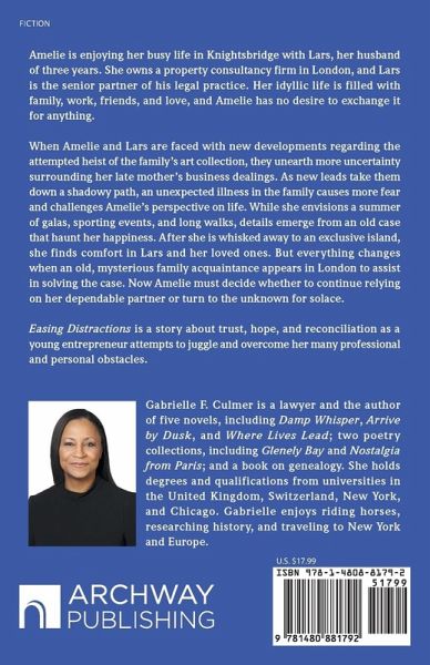 Amelie is enjoying her busy life in Knightsbridge with Lars, her husband of three years. She owns a property consultancy firm in London, and Lars is the senior partner of his legal practice. Her idyllic life is filled with family, work, friends, and love, and Amelie has no desire to exchange it for anything. When Amelie and Lars are faced with new developments regarding the attempted heist of the family's art collection, they unearth more uncertainty surrounding her late mother's business dealings. As new leads take them down a shadowy path, an unexpected illness in the family causes more fear and challenges Amelie's perspective on life. While she envisions a summer of galas, sporting events, and long walks, details emerge from an old case that haunt her happiness. After she is whisked away to an exclusive island, she finds comfort in Lars and her loved ones. But everything changes when an old, mysterious family acquaintance appears in London to assist in solving the case. Now Amelie must decide whether to continue relying on her dependable partner or turn to the unknown for solace. Easing Distractions is a story about trust, hope, and reconciliation as a young entrepreneur attempts to juggle and overcome her many professional and personal obstacles.