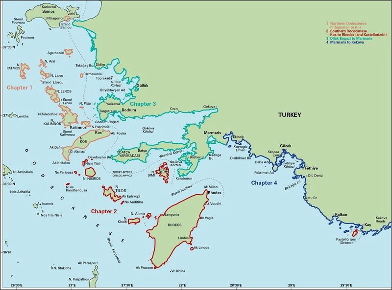 Greek Dodecanese islands and the Turkish coast from the Samos Strait as far east as Kas and Kekova