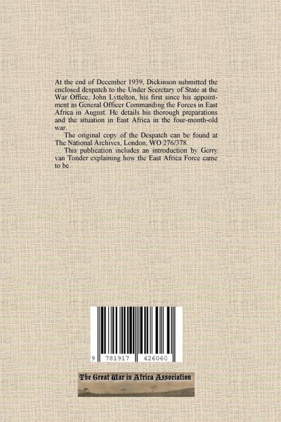 At the end of December 1939, Dickinson submitted the enclosed despatch to the Under Secretary of State at the War Office, John Lyttelton, his first since his appointment as General Officer Commanding the Forces in East Africa in August. He details his thorough preparations and the situation in East Africa in the four-month-old war. The original copy of the Despatch can be found at The National Archives, London, WO 276/378. This publication includes an introduction by Gerry van Tonder explaining how the East Africa Force came to be.