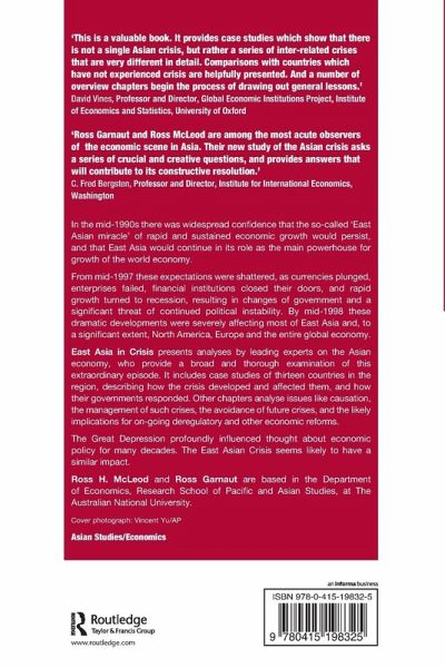 Part I. Overview 1. East Asia in Crisis Ross Garnaut and Ross McLeod Part II. Case Studies: The Troubled Economies 2. Indonesia Ross McLeod 3. Thailand Peter G. Warr 4. Korea Heather Smith 5. Malaysia Prema-chandra Athukorala Part III. Case Studies: Safe Behind Closed Doors? 6. China Ligang Song 7. Vietnam Suiwah Leung and Le Dang Doanh 8. India sisira Jayasuriya Part IV. Case Studies: Other Countries' Experience 9. The Philippines Ponciano Intal Jr, Celia Reyes, Leilanie Basilio and Melanie Milo 10.Singapore and Hong Kong Cheng Yuk-shing, Marn Heong Wong and Christopher Findlay 11. Taiwan Shirley W. Y. Kuo and Christina Y. Liu 12. Japan Akiyoshi Horiuchi 13. Australia David Gruen, Brian Gray and Glenn Stevens Part V. Global Perspectives 14. Internationally Mobile Capital and the Global Economy Warwick J McKibbin 15. The Role of the International Monetary Fund David C.L. Nellor 16. Will Mexico's Recovery from Crisis be a Model for East Asia? David Hale Part VI. Policy Implications 17. The Role of Prudential Regulation. George Fane 18. Exchange Rate Regimes for the Future Alan A. Walters 19. Long-term Implications for Developing Countries hadi Soesastro Part VII. Reflections on the Crisis 20. The New Era of Financial Fragility Ross H. McLeod. 21. Economic Lessons Ross Garnaut