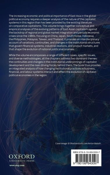 The increasing economic and political importance of East Asia in the global political economy requires a deeper analysis of the nature of the capitalist systems in this region than has been provided by the existing literature on comparative capitalisms. This volume brings together conceptual and empirical analyses of the evolving patterns of East Asian capitalism against the backdrop of regional and global market integration and periodic economic crises since the 1980s. Focusing on China, Japan, South Korea, Indonesia, the Philippines, Malaysia, Taiwan, and Thailand, it provides an interdisciplinary account of variations, continuities, and changes in the institutional structures that govern financial systems, industrial relations, and product markets, and that shape the evolution of national political economies. While the volume encompasses a range of different cases, specific issues, and diverse methodologies, all the chapters address two dominant themes - the continuities and changes in the institutional underpinnings of capitalist development and the main driving forces behind them. The book thus provides an integrated analysis of how changing institutional practices in business, financial, and labour systems interact and affect the evolution of capitalist political economies in the region.