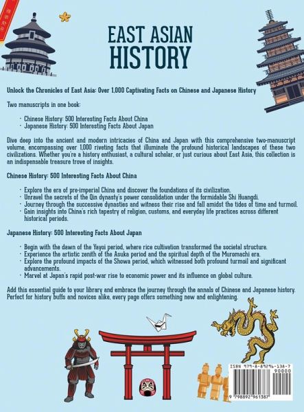 Unlock the Chronicles of East Asia: Over 1,000 Captivating Facts on Chinese and Japanese History Two manuscripts in one book: Chinese History: 500 Interesting Facts About China Japanese History: 500 Interesting Facts About Japan Dive deep into the ancient and modern intricacies of China and Japan with this comprehensive two-manuscript volume, encompassing over 1,000 riveting facts that illuminate the profound historical landscapes of these two civilizations. Whether you're a history enthusiast, a cultural scholar, or just curious about East Asia, this collection is an indispensable treasure trove of insights. Features: Detailed chapters covering significant eras and turning points in the histories of China and Japan. Insights into the socio-political and cultural evolution through centuries. A focus on both widely known and obscure facts that provide a fuller picture of each nation's history. Engaging narratives that bring the past to life, providing context to historical events and figures.