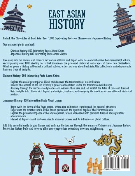 Unlock the Chronicles of East Asia: Over 1,000 Captivating Facts on Chinese and Japanese History Two manuscripts in one book: Chinese History: 500 Interesting Facts About China Japanese History: 500 Interesting Facts About Japan Dive deep into the ancient and modern intricacies of China and Japan with this comprehensive two-manuscript volume, encompassing over 1,000 riveting facts that illuminate the profound historical landscapes of these two civilizations. Whether you're a history enthusiast, a cultural scholar, or just curious about East Asia, this collection is an indispensable treasure trove of insights. Features: Detailed chapters covering significant eras and turning points in the histories of China and Japan. Insights into the socio-political and cultural evolution through centuries. A focus on both widely known and obscure facts that provide a fuller picture of each nation's history. Engaging narratives that bring the past to life, providing context to historical events and figures.
