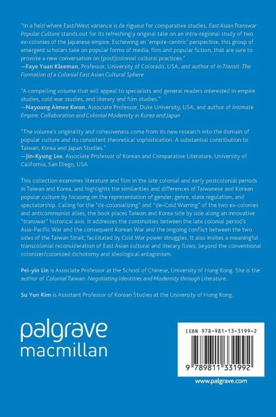 This collection examines literature and film studies from the late colonial and early postcolonial periods in Taiwan and Korea, and highlights the similarities and differences of Taiwanese and Korean popular culture by focusing on the representation of gender, genre, state regulation, and spectatorship. Calling for the "de-colonializing" and "de-Cold Warring" of the two ex-colonies and anticommunist allies, the book places Taiwan and Korea side by side in a "trans-war" frame. Considering Taiwan-Korea relations along a new trans-war axis, the book focuses on the continuities between the late colonial period's Asia-Pacific War and the consequent Korean War and the ongoing conflict between the two sides of the Taiwan Strait, facilitated by Cold War power struggles. The collection also invites a meaningful transcolonial reconsideration of East Asian cultural and literary flows, beyond the conventional colonizer/colonized dichotomy and ideological antagonism.