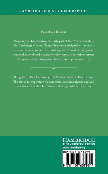 Originally published during the early part of the twentieth century, the Cambridge County Geographies were designed to provide a series of concise guides to British regions. Aimed at the general reader, they combined a comprehensive approach to various aspects of physical and human geography with an emphasis on clarity. This guide to East Lothian by T. S. Muir was first published in 1915. The text is interspersed with numerous illustrative figures and also contains a list of the chief towns and villages within the county.