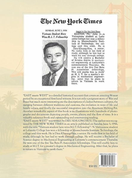 "EAST meets WEST" is a detailed historical account that covers an amazing 86-year period by an exceptional first-hand witness. It is not only a poignant story of War and Peace but much more interesting are the descriptions of clashes between cultures, the merging between different traditions and customs, the evolution in ways of life and family values, and finally the successful integration into the American Melting Pot. Another remarkable aspect of this book is its illustrations with hundreds of photographs and documents depicting people, events, places, and the flow of time. It is a valuable reference book and outstanding and entertaining reading. "EAST meets WEST" was written by HUU DIEU KHUONG. The author was recognized by THE NEW YORK TIMES in an article published on Sunday, June 3, 1956, with the title "Vietnam student here wins M.I.T. Fellowship": "A Vietnamese student at Lafayette College has won a fellowship at Massachusetts Institute Technology, the college said this week. He is Dieu Khuong-Huu, a senior. He ranks first in his field of study, although he has had to work through college. He will receive a Bachelor of Science in Mechanical Engineering at Lafayette's commencement Thursday. He won one of the five Tau Beta Pi Association fellowships. This will enable him to study at M.I.T. for a master's degree in Mechanical Engineering. After that, he plans to return to Vietnam to work there."