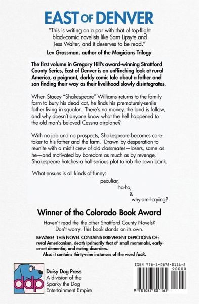 When Shakespeare Williams returns to his family’s farm in eastern Colorado to bury his dead cat, he finds his widowed and senile father Emmett living in squalor. He has no money, the land is fallow, and a local banker has cheated his father out of the majority of the farm equipment and his beloved Cessna. With no job and no prospects, Shakespeare suddenly finds himself caretaker to both his dad and the farm, and drawn into an unlikely clique of old high school classmates: Vaughn Atkins, a paraplegic confined to his mother’s basement, Carissa McPhail, an overweight bank teller who pitches for the local softball team, and longtime bully D.J. Beckman, who now deals drugs throughout small-town Dorsey. Facing the loss of the farm, Shakespeare hatches a half-serious plot with his father and his fellow gang of misfits to rob the very bank that has stolen their future. Mixing pathos and humor in equal measure, Gregory Hill’s East of Denver is an unflinching novel of rural America, a poignant, darkly funny tale about a father and son finding their way together as their home and livelihood inexorably disappears.