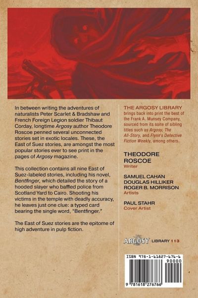 In between writing the adventures of naturalists Peter Scarlet & Bradshaw and French Foreign Legion soldier Thibaut Corday, longtime Argosy author Theodore Roscoe penned several unconnected stories set in exotic locales. These, the East of Suez stories, are amongst the most popular stories ever to see print in the pages of Argosy magazine. This collection contains all nine East of Suez-labeled stories, including his novel, Bentfinger, which detailed the story of a hooded slayer who baffled police from Scotland Yard to Cairo. Shooting his victims in the temple with deadly accuracy, he leaves just one clue: a typed card bearing the single word, "Bentfinger." The East of Suez stories are the epitome of high adventure in pulp fiction.