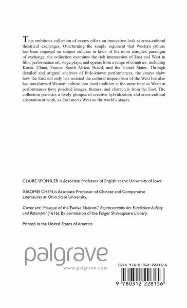 This ambitious collection offers an innovative look at crosscultural theatrical exchanges. Overturning the argument that Western culture has been imposed on subject cultures in favor of the paradigm of exchange, East of West examines the rich intersection of East and West in film, television shows, stage plays, and operas from a range of countries. The essays show how the East not only has resisted the cultural imperialism of the West but has transformed Western culture into local tradition at the same time as Western performances have poached images, themes, and characters from the East. The essays provide a lively glimpse of creative hybridization and crosscultural adaptation, as East meets West on the world s stages.