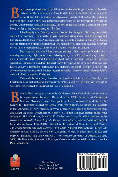 Both mature professionals, they fell in love with childlike glee. John and Dorothy had met briefly in New Jersey. A medical doctor from Australia, he was en route to the British Isles to further his education. Friends of Dorothy, also a doctor, had fixed them up on a blind date neither looked forward to. Yet they had fun. When she decided on a summer vacation in England, her best friend and traveling companion Helen broke her leg at the last moment, as if by fate. John happily saw Dorothy around London but thought of her only as a lady doctor from America. Then, in the hospital matron's sitting room, something happened that changed both their lives. A rushed courtship, a simple wedding in Wesley's Chapel, and the briefest of honeymoons followed. She sailed home, and John, scarcely believing he was now a married man, stayed on at St. Paul's Hospital in London. For three months, the Atlantic separated them. John wrote to Dorothy every morning and every night, never once missing a day. A self-confessed very ordinary man, he revealed much about himself and about how he coped in London during their separation, devising a hundred different ways to express his love for Dorothy. His letters convey a refreshing earnestness and honesty. Although Dorothy's half of the correspondence has not survived, her mysterious cable, "Come at once!" assured John's arrival in East Orange by Christmas. This tenderhearted story, based on the love letters John wrote to Dorothy from London in 1933 and including numerous excerpts, is told by their son for those of us who have experienced or imagined the love of a lifetime. Born in New Jersey and raised in California, John Kessell did not set out to be a professional historian. His work in the 1960s, however, at Tumacacori National Monument in New Mexico, site of a Spanish colonial mission, alerted him to the possibility. Returning to graduate school with new purpose, he earned his doctorate at the University of New Mexico, survived a decade as historian-for-hire, and joined the UNM Department of History. His major historical editing project with colleagues Rick Hendricks, Meredith D. Dodge, and Larry D. Miller resulted in the six-volume "Journals of don Diego de Vargas, New Mexico, 1691 - 1704." Kessell is also author of "Kiva, Cross and Crown: The Pecos Indians and New Mexico, 1540 - 1840"; "The Missions of New Mexico Since 1776"; and "Pueblos, Spaniards, and the Kingdom of New Mexico."