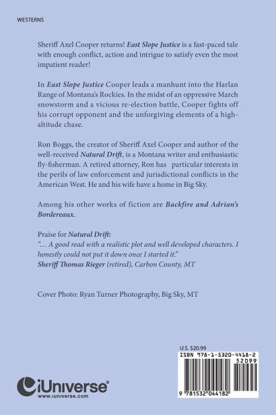Sheriff Axel Cooper returns! East Slope Justice is a fast-paced tale with enough conflict, action and intrigue to satisfy even the most impatient reader! In East Slope Justice Cooper leads a manhunt into the Harlan Range of Montanas Rockies. In the midst of an oppressive March snowstorm and a vicious re-election battle, Cooper fights off his corrupt opponent and the unforgiving elements of a high-altitude chase. Ron Boggs, the creator of Sheriff Axel Cooper and author of the well-received Natural Drift, is a Montana writer and enthusiastic fly-fisherman. A retired attorney, Ron has particular interests in the perils of law enforcement and jurisdictional conflicts in the American West. He and his wife have a home in Big Sky. Among his other works of fiction are Backfire and Adrians Bordereaux. Praise for Natural Drift: A good read with a realistic plot and well developed characters. I honestly could not put it down once I started it. Sheriff Thomas Rieger (retired), Carbon County, MT