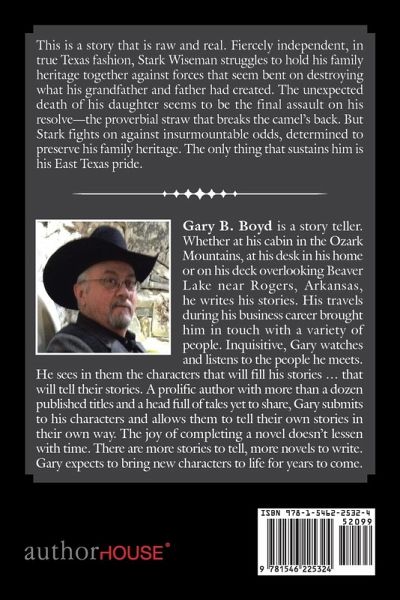 This is a story that is raw and real. Fiercely independent, in true Texas fashion, Stark Wiseman struggles to hold his family heritage together against forces that seem bent on destroying what his grandfather and father had created. The unexpected death of his daughter seems to be the final assault on his resolvethe proverbial straw that breaks the camels back. But Stark fights on against insurmountable odds, determined to preserve his family heritage. The only thing that sustains him is his East Texas pride.