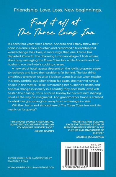 Friendship. Love. Loss. New beginnings. Find it all at The Three Coins Inn. It's been four years since Emma, Annarita and Tiffany threw their coins in Rome's Trevi Fountain and cemented a friendship that would change their lives, in more ways than one. Emma has departed Rome for the charming Umbrian village of Todi, where she's busy managing the Three Coins Inn, while Annarita and her husband run the hotel's cooking classes. A new set of hotel guests descend on the idyllic property, eager to recharge and leave their problems far behind. The last thing ambitious television reporter Madison wants is a two-week respite in sleepy Umbria, but when things fall apart, she may not have a choice in the matter. Heike is mourning her husband's death, and hopes a change in scenery in a country they once both loved will hasten the healing. Chris' surprise holiday for his wife isn't shaping up at all the way he imagined it. And grandmother Grace is enlisted to whisk her granddaughter away from a marriage in crisis. Will the charm and atmosphere of The Three Coins Inn work its magic on its guests?