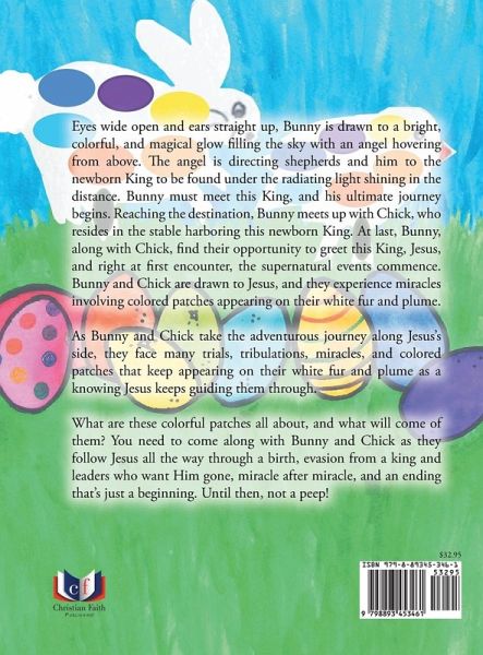 Eyes wide open and ears straight up, Bunny is drawn to a bright, colorful, and magical glow filling the sky with an angel hovering from above. The angel is directing shepherds and him to the newborn King to be found under the radiating light shining in the distance. Bunny must meet this King, and his ultimate journey begins. Reaching the destination, Bunny meets up with Chick, who resides in the stable harboring this newborn King. At last, Bunny, along with Chick, find their opportunity to greet this King, Jesus, and right at first encounter, the supernatural events commence. Bunny and Chick are drawn to Jesus, and they experience miracles involving colored patches appearing on their white fur and plume. As Bunny and Chick take the adventurous journey along Jesus's side, they face many trials, tribulations, miracles, and colored patches that keep appearing on their white fur and plume as a knowing Jesus keeps guiding them through. What are these colorful patches all about, and what will come of them? You need to come along with Bunny and Chick as they follow Jesus all the way through a birth, evasion from a king and leaders who want Him gone, miracle after miracle, and an ending that's just a beginning. Until then, not a peep! Interactive Magnetic Storyboard for the Easter Bunny and Chick can be found at CLoganDesignsStudio.Etsy.com