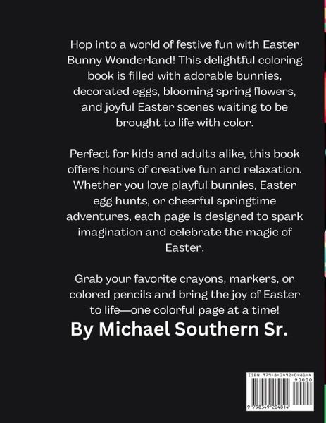 Hop into a world of festive fun with Easter Bunny Wonderland! This delightful coloring book is filled with adorable bunnies, decorated eggs, and joyful Easter scenes waiting to be brought to life with color. Perfect for kids and adults alike, this book offers hours of creative fun and relaxation. Whether you love playful bunnies, Easter egg hunts, or cheerful springtime adventures, each page is designed to spark imagination and celebrate the magic of Easter. Grab your favorite crayons, markers, or colored pencils and bring the joy of Easter to life-one colorful page at a time!