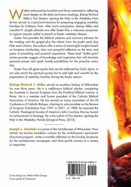 Widely embraced by homilists and those interested in reflecting more deeply on the daily Lectionary readings, Bishop Richard Sklba's Fire Starters: Igniting the Holy in the Weekday Homily has served as a practical resource for preparing engaging weekday homilies for Ordinary Time. After much anticipation, Bishop Sklba and coauthor Fr. Joseph Juknialis now offer Easter Fire, a welcome companion to support anyone called to preach at Easter weekday Masses. Easter Fire provides the biblical citations and summary phrases for the reading and the gospel plus the refrain from the psalm each day. After each citation, the authors offer a series of meaningful insights based on Scripture scholarship, their own prayerful reflection on the texts, and years of preaching and pastoral experience. These brief "bullet point" entries provide nuggets of knowledge and inspiration that will stimulate personal prayer and spark homily possibilities for the preacher every day. Easter Fire will ignite sparks that can be enflamed by God's Spirit, to not only enrich the spiritual journey but to add light and warmth for the preparation of weekday homilies during the Easter season.