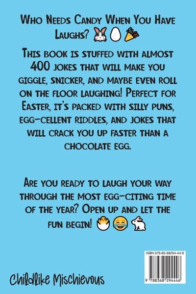 Get Ready for Giggles, Grins, and a Whole Lot of Easter Fun! Easter Jokes for Kids is the ultimate joke book packed with almost 400 hilarious jokes and riddles that are perfect for boys, girls, and the whole family. From egg-citing Easter puns and silly springtime giggles to adorable bunnies and laugh-out-loud surprises, this book has something for everyone! Whether you're hunting for eggs, enjoying Easter brunch, or sharing laughs with family at home, these clean and funny jokes will keep kids smiling from ages 5 to 12 - and even teens, mom, dad, grandma, and grandpa will want in on the fun! Why You'll Love This Book: Perfect for Kids: Clean, family-friendly jokes that children can share with friends, siblings, and classmates. Packed with Themes: Easter eggs, bunnies, springtime fun, animals, food, and even magical Easter surprises! Great for Gifting: Makes a fantastic Easter basket stuffer, party favor, or holiday treat. Fun for Everyone: Short and simple jokes that bring laughter to every moment and create lasting memories! Make this Easter extra special with joy, laughter, and a basket full of giggles-because smiles are the sweetest treat of all!
