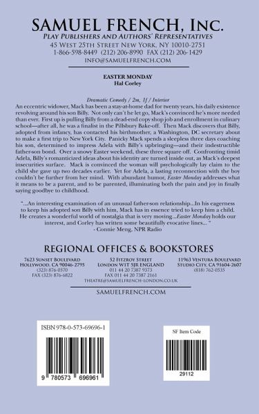 Dramatic Comedy / 2m, 1f / Interior An eccentric widower, Mack has been a stay-at-home dad for twenty years, his daily existence revolving around his son Billy. Not only can't he let go, Mack's convinced he's more needed than ever. First up is pulling Billy from a dead-end copy shop job and enrollment in culinary school-after all, he was a finalist in the Pillsbury Bake-off. Then Mack discovers that Billy, adopted from infancy, has contacted his birthmother, a Washington, DC secretary about to make a first trip to New York City. Panicky Mack spends a sleepless three days coaching his son, determined to impress Adela with Billy's upbringing-and their indestructible father-son bond. Over a snowy Easter weekend, these three square off. Confronting timid Adela, Billy's romanticized ideas about his identity are turned inside out, as Mack's deepest insecurities surface. Mack is convinced the woman will psychologically lay claim to the child she gave up two decades earlier. Yet for Adela, a lasting reconnection with the boy couldn't be further from her mind. With abundant humor, Easter Monday addresses what it means to be a parent, and to be parented, illuminating both the pain and joy in finally saying goodbye to childhood. .."..An interesting examination of an unusual father-son relationship... The Sondheim lyrics 'stay a child while you can be a child' are embodied in Mack, the overprotective father. In his eagerness to keep his adopted son Billy with him, Mack has in essence tried to keep him a child. He creates a wonderful world of nostalgia that is very moving... Easter Monday holds our interest, and Corley has written some beautifully evocative lines ... " -Connie Meng, NPR Radio Character Descriptions: MACK: 55-ish; a radically sentimental, unapologetic Pollyanna; unselfconscious, devoid of vanity, he's alternately tender, prickly, impatient, cuddly, bullying, at times fiercely defensive and aggressively paternal. BILLY: Mack's son, 20; attractively boyish, yet preternaturally world-weary; gentle, introspective and cautious, he has developed a short fuse, and though desperate to avoid confrontation, he can turn combative. ADELA: Billy's birthmother; 35; unprepossessing, plain-spoken and intensely focused on whatever meager task is at hand; though decidedly meek, she's capable of standing up for the truth - and herself. Please contact Samuel French, Inc. (www.samuelfrench.com) for performance licensing inquiries.
