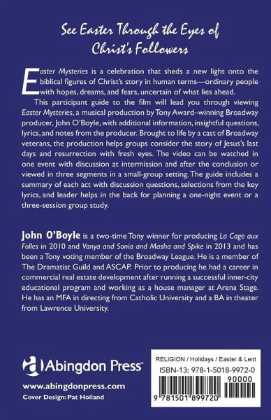 The story is a celebration that sheds a new light onto the biblical figures of Christ's story in human terms--ordinary people with hopes, dreams, and fears, uncertain of what lies ahead. This participant guide to the film will lead you through viewing Easter Mysteries, a musical production by Tony Award-winning Broadway producer, John O'Boyle, with additional information, insightful questions, lyrics, and notes from the producer. Brought to life by a cast of Broadway veterans, the production helps groups consider the story of Jesus's last days and resurrection with fresh eyes. The video can be watched in one event with discussion at intermission and after the conclusion or viewed in three segments in a small-group setting. The guide includes a summary of each act with discussion questions, selections from the key lyrics, and leader helps in the back for planning a one-night event or a three-session group study.