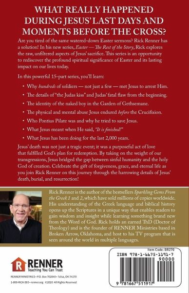 What Really Happened During Jesus' Last Days and Moments Before the Cross? Are you tired of the same watered-down Easter sermons? Rick Renner has a solution! In his new series, Easter - The Rest of the Story, Rick explores the raw, unfiltered aspects of Jesus' sacrifice. This series is an opportunity to rediscover the profound spiritual significance of Easter and its lasting impact on our lives today. In this powerful 15-part series, you'll learn: Why hundreds of soldiers - not just a few - met Jesus to arrest Him. The details of "the Judas kiss" and Judas' fatal flaw from the beginning. The identity of the naked boy in the Garden of Gethsemane. The physical and mental abuse Jesus endured before the Crucifixion. Who Pontius Pilate was and why he tried to save Jesus. What Jesus meant when He said, "It is finished!" What Jesus has been doing for the last 2,000 years. Jesus' death was not just a tragic event; it was a purposeful act of love that fulfilled God's plan for redemption. By taking on the weight of our transgressions, Jesus bridged the gap between sinful humanity and the holy God of creation. Celebrate the gift of forgiveness, grace, and eternal life as you join Rick Renner on this journey through the harrowing details of Jesus' death, burial, and resurrection!