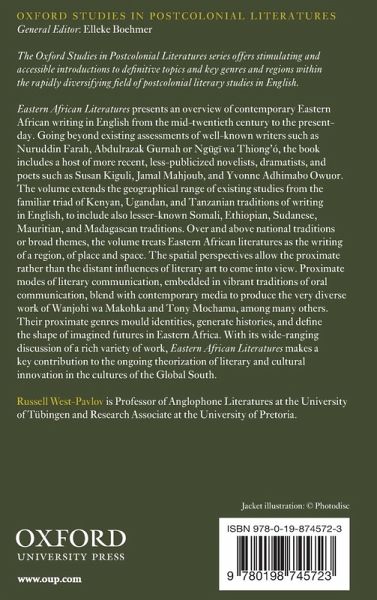 The Oxford Studies in Postcolonial Literatures series offers stimulating and accessible introductions to definitive topics and key genres and regions within the rapidly diversifying field of postcolonial literary studies in English. This volume offers an overview of contemporary Eastern African writing in English since the mid-twentieth century. It takes a fresh look at what has been an under-represented regional literary tradition within what continues to be an under-represented continental literary tradition. In particular, it broadens the scope of such an overview, complementing the extant monographs on well-known Eastern African writers such as Ng¿g¿ to include a host of more recent, less-publicized novelists, dramatists, and poets. It extends the geographical range of existing studies from the familiar triad of Kenyan, Ugandan, and Tanzanian traditions of writing in English, to include the lesser-known Somali, Ethiopian, or Sudanese, or Mauritian or Madagascan traditions. Rather than simply addressing national traditions or broad thematic bundles, the volume treats works as literatures of a region: that is, as literatures of place and space. Eastern African Literatures stresses the formative role of space, place and geography in fashioning the fabric of social interaction, whether individual or collective, in generating history, in moulding identities, and as a consequence in defining the shape of the future. The 'spatial' perspectives allow the 'proximate' rather than the 'distant' influence of literary art to come into view. Proximate modes of literary communication, arising out of residual but vibrant traditions of oral communication, blend with contemporary media to produce hybrid genres of proximity specific to Eastern African literary production. In this way, the book also makes a contribution to the ongoing theorization of literary and cultural innovation in the cultures of the Global South.
