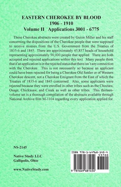 The Eastern Cherokee by Blood series Volumes I - XIII is the most complete series in pure transcribed form (from National Archival film, M-1104) of the Cherokee abstracts available and beyond, nothing added, nothing taken away. From the first application to the last (45,857) representing approximately 90,000 individuals and then in Volume XIII The Exceptions Filed to Guion Miller's Report of May 28, 1909, and submitted on January 5, 1910. The complete record of application decisions gives both those accepted and rejected. There are thousands of names and families involved in this finished series. Let it be known that if there are rejections it may not mean the applicant is not Cherokee, only due to the fact that they may not have been related to an Emigrant Cherokee during the time of removal. Their ancestor could have belonged to a different tribe or have been an Old Settler Cherokee, a Western-born Cherokee, or possibly even a Texas-born Cherokee that had family that left the east as early as 1818-1820.¿The Miller Application numbers are totally different than a regular roll number, which contains an index of names that may lead to a person's family tribal enrollment card through that number. The enrollment card also has vital information such as name, family relations, age, sex, blood quantum, etc. But the Miller Applications can lead you to generations of family information and history along with, in many cases, testimony not just from family but neighbors, tribal members and acquaintances. The books not only can lead you to Cherokee blood as a descendant of an Emigrant Cherokee but also to thousands of other Cherokee bloodlines as well as possibly relations to other tribes during testimony. So these materials are a researcher's dream come true.