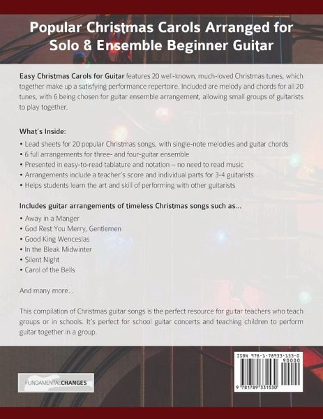 Learn 20 Beautiful Christmas Songs for Solo Guitar and Ensemble * 20 popular Christmas song melodies for single note guitar + chords * 6 arrangements for three and four guitar ensemble * Presented in easy-to-read tablature and notation. No need to read music * Arrangements include a teacher's score and individual parts for 3-4 guitarists * Helps students learn the art and skill of performing with other guitarists Twenty Christmas song melodies + chords * Are you a guitar teacher who struggles to find Christmas melodies for your students to play together? * Are you a guitarist who wants to play Christmas with other guitar players? Easy Christmas Carols for Guitar features 20 well-known, much-loved Christmas tunes Together they make up a satisfying performance repertoire with melody and chords, with six pieces being chosen for three-guitar ensemble arrangement allowing small groups of guitarist to play together. Includes guitar arrangements of timeless Christmas songs such as… * Away in a Manger * God Rest You Merry, Gentlemen * Good King Wenceslas * In the Bleak Midwinter * Silent Night * Carol of the Bells And many more… This compilation of Christmas guitar songs is the perfect resource for guitar teachers who teach groups or in schools. It's perfect for school guitar concerts and teaching children to perform guitar together in a group. Buy it now and discover how rewarding it can be to play guitar and perform with others.