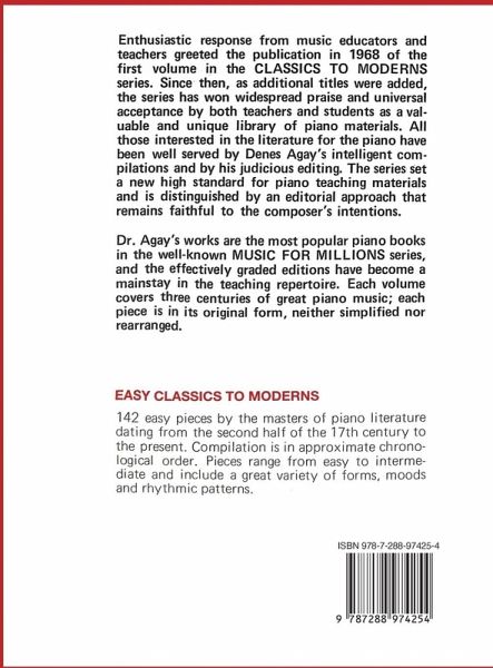 Easy Classics to Moderns Compiled and Edited by Denes Agay These 142 pieces by the masters of piano literature date from the second half of the 17th century to the present day.