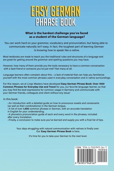 What is the hardest challenge you've faced as a student of the German language? You can work hard on your grammar, vocabulary and pronunciation, but being able to communicate naturally isn't easy. In fact, the toughest part of learning German is knowing how to speak like a native. Most textbooks are made to teach you the traditional rules and structures of a language and are great for getting around the grammar and spelling questions you may have. However, how many of them provide you the tools necessary to have a common conversation with a best friend or someone you've just met? Not many at all. Language learners often complain about this - a lack of material that can help you familiarize yourself with the most common phrases used in everyday conversation and in native surroundings. For this reason, we at Lingo Mastery have developed Easy German Phrase Book: Over 1500 Common Phrases for Everyday Use and Travel for you, our favorite language-learner, so that you may find the best expressions for common usage in Germany and communicate with your German friends, colleagues and client without any issue! In this book:An introduction with a detailed guide on how to pronounce vowels and consonants (as well as their combinations) in the German tongue. A list of over 1,500 common phrases in German, with an accurate translation in English for your understanding. A phonetics pronunciation guide of each and every word in the phrases, included after every translation. Finally, a conclusion to make sure you've learned and supply you with a final list of tips. Your days struggling with natural communication with natives is finally over. Our Easy German Phrase Book is here. It's time for you to take your German to the next level.