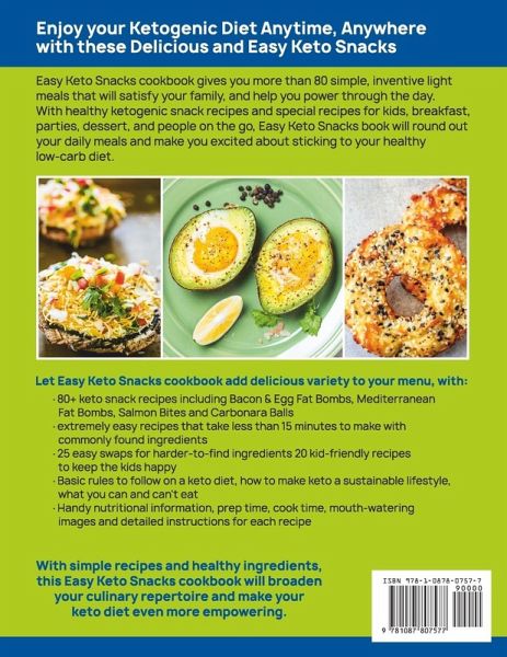 Enjoy your Ketogenic Diet Anytime, Anywhere with these Delicious and Easy Keto Snacks! Easy Keto Snacks cookbook gives you more than 80 simple, inventive light meals that will satisfy your family, and help you power through the day. With healthy ketogenic snack recipes and special recipes for kids, breakfast, parties, dessert, and people on the go, Easy Keto Snacks book will round out your daily meals and make you excited about sticking to your healthy low-carb diet. Let Easy Keto Snacks cookbook add delicious variety to your menu, with: 80+ keto snack recipes including Bacon & Egg Fat Bombs, Mediterranean Fat Bombs, Salmon Bites and Carbonara Balls Extremely easy recipes that take less than 15 minutes to make with commonly found ingredients 25 easy swaps for harder-to-find ingredients 20 kid-friendly recipes to keep the kids happy Basic rules to follow on a keto diet, how to make keto a sustainable lifestyle, what you can and can’t eat Handy nutritional information, prep time, cook time, mouth-watering images and detailed instructions for each recipe With simple recipes and healthy ingredients, this Easy Keto Snacks cookbook will broaden your culinary repertoire and make your keto diet even more empowering. Use these healthy and easy recipes and start cooking today!