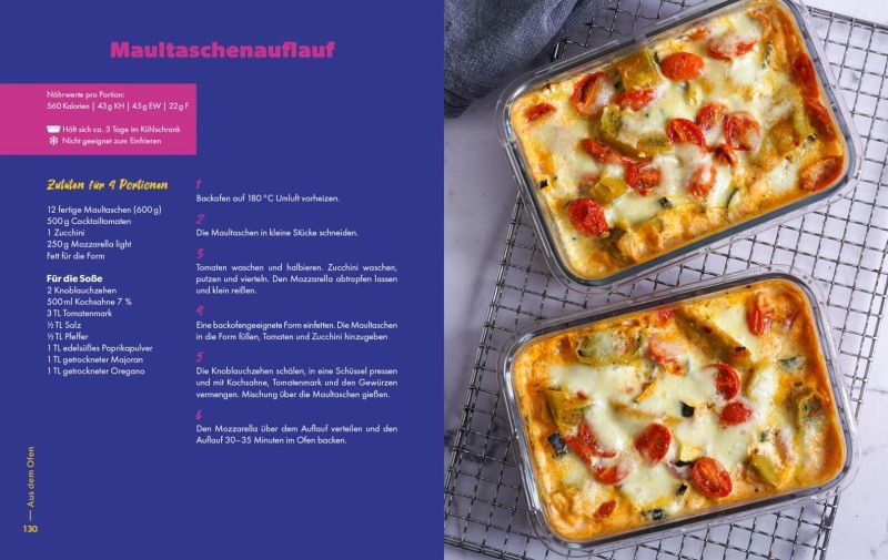 - Herzhafte Aufläufe wie sahniger Kartoffel-Lachs-Auflauf mit Gemüse, raffinierter Maultaschenauflauf oder leckere Zucchini-Lasagne