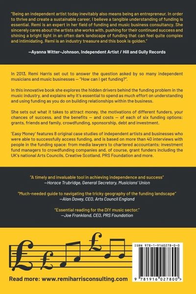 In 2013, Remi Harris set out to answer the question asked by so many independent musicians and music businesses - "How can I get funding?". In this innovative book she explores the hidden drivers behind the funding problem in the music industry, and explains why it's essential to spend as much effort on understanding and using funding as you do on building relationships within the business. She sets out what it takes to attract money, the motivations of different funders, your chances of success, and the benefits - and costs - of each of six funding options: grants, friends and family, crowdfunding, sponsorship, debt and investment. 'Easy Money' features 8 original case studies of independent artists and businesses who were able to successfully access funding, and is based on more than 40 interviews with people in the funding space: from media lawyers to chartered accountants; investment fund managers to crowdfunding companies and, of course, grant funders including the UK's national Arts Councils, Creative Scotland, PRS Foundation and more.