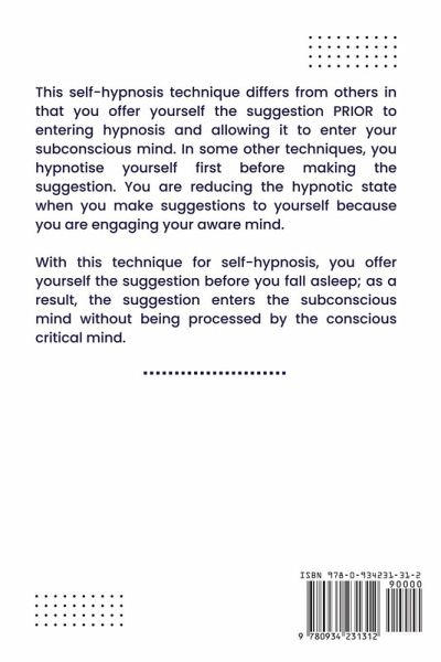 This self-hypnosis technique differs from others in that you offer yourself the suggestion PRIOR to entering hypnosis and allowing it to enter your subconscious mind. In some other techniques, you hypnotise yourself first before making the suggestion. You are reducing the hypnotic state when you make suggestions to yourself because you are engaging your aware mind. With this technique for self-hypnosis, you offer yourself the suggestion before you fall asleep; as a result, the suggestion enters the subconscious mind without being processed by the conscious critical mind. I did not "create" this self-hypnosis technique. In his book Master Course in Hypnotism, Harry Arons introduced the concept of making a suggestion to yourself before entering hypnosis. Harry, who I knew well, gave me his approval to utilise this self-hypnosis technique. I've used his approach with some of my own modifications. I instruct all of my clients in this self-hypnosis technique, as well as the students I certify.