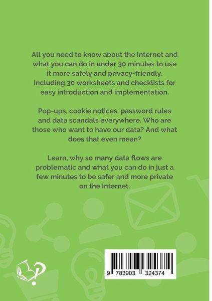 All you need to know about the Internet and what you can do in under 30 minutes to use it more safely and privacy-friendly. Including 30 worksheets and checklists to help you improve your own Internet safety and privacy. Pop-ups, cookie notices, password rules and data scandals everywhere. Who are those who want to have our data? And what does that even mean? Learn, why so many data flows are problematic and what you can do in just a few minutes to be safer and more private on the Internet.