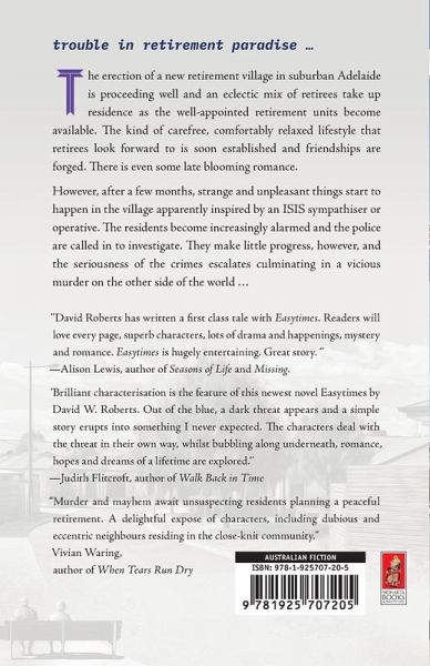 The erection of a new retirement village in suburban Adelaide is proceeding well and an eclectic mix of retirees take up residence as the well-appointed retirement units become available. The kind of carefree, comfortably relaxed lifestyle that retirees look forward to is soon established and friendships are forged. There is even some late blooming romance. However, after a few months, strange and unpleasant things start to happen in the village apparently inspired by an ISIS sympathiser or operative. The residents become increasingly alarmed and the police are called in to investigate. They make little progress, however, and the seriousness of the crimes escalates culminating in a vicious murder on the other side of the world ...
